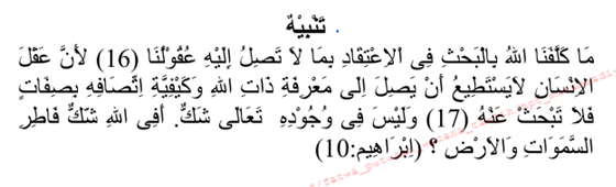 Allah tidak menyuruh kita membicarakan hal-hal yang tidak tercapai oleh akal dalam hal kepercayaan (16). Sebab akal manusia tidak mungkin mencapai pengertian tentang Dzat Allah dan hubungannya dengan sifat-sifat yang ada pada-Nya. Maka janganlah engkau membicarakan hal itu (17). Tak ada