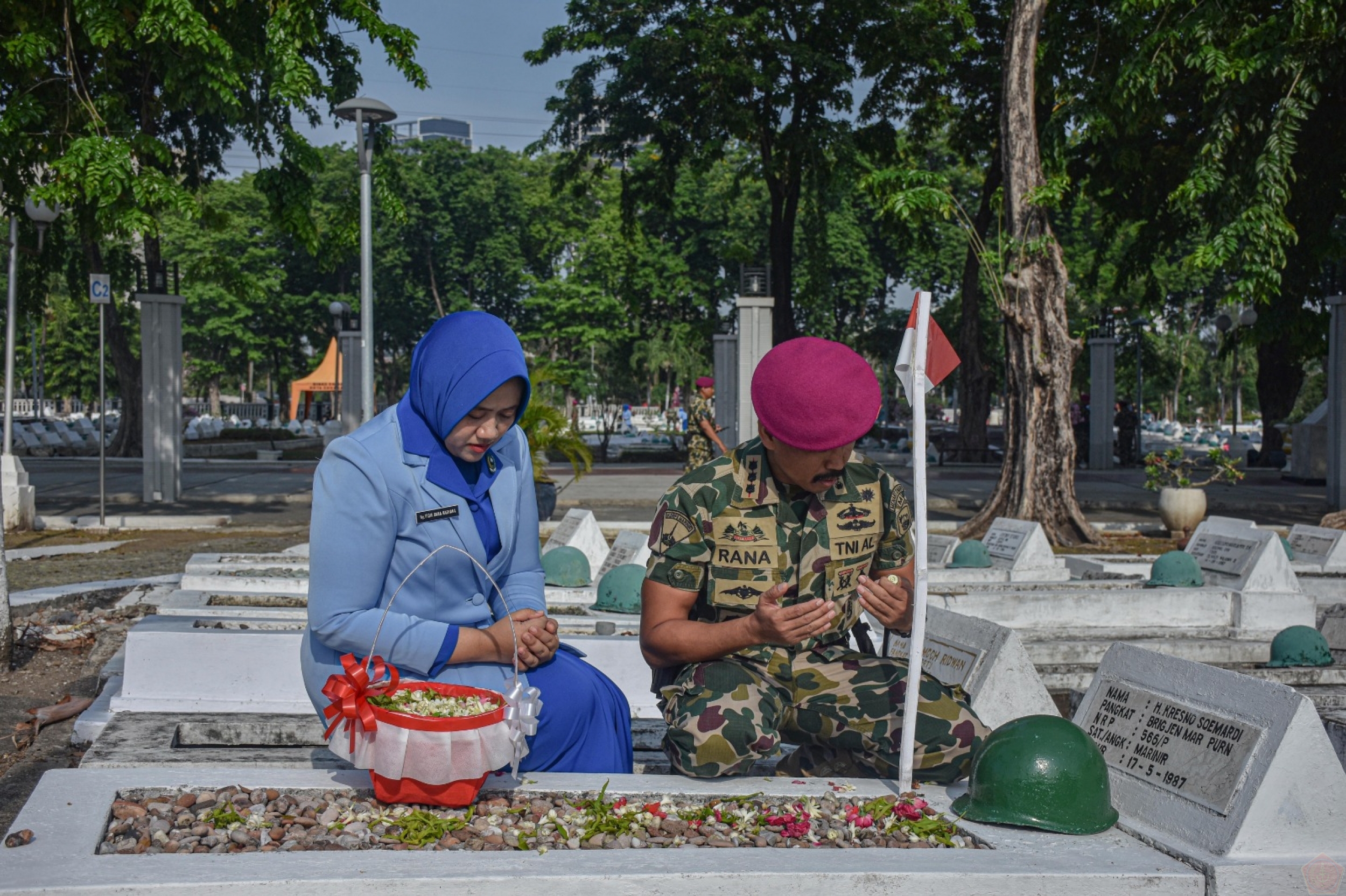 Komandan Menart 2 Marinir, didampingi Ketua Jalasenastri Cabang 4, melakukan tabur bunga di pusara para pahlawan. Tabur bunga ini sebagai bentuk penghormatan kepada jasa para pahlawan.