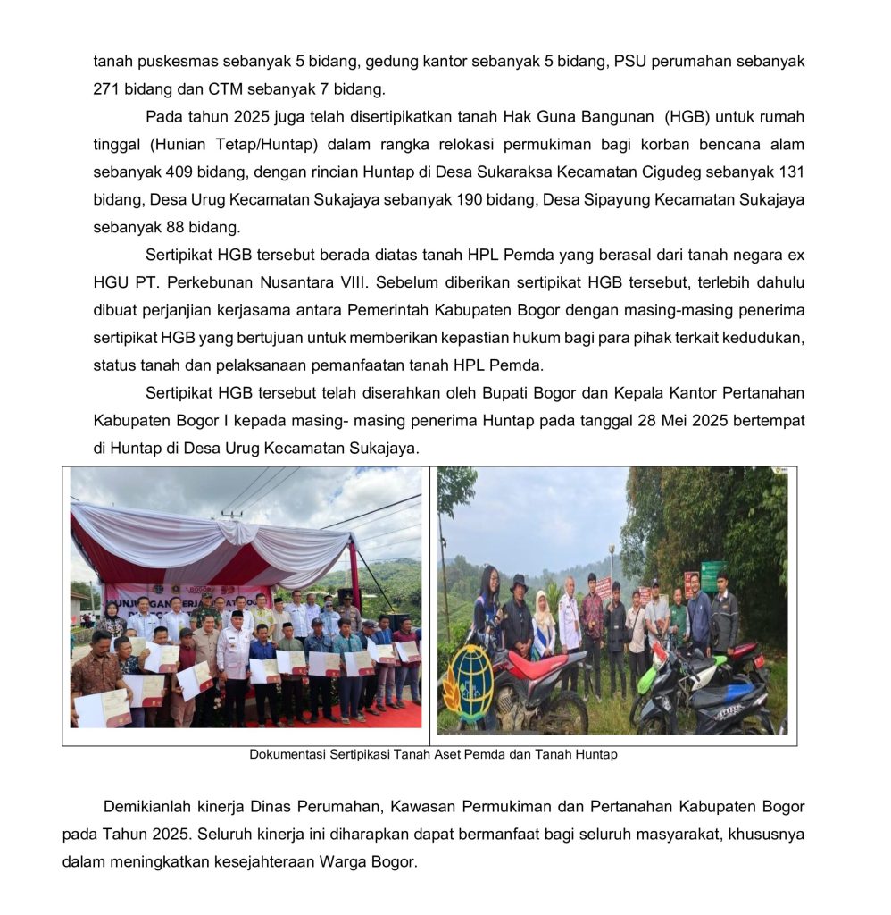 Dalam upaya penyelesaian penanganan pasca bencana yang terjadi pada tahun 2020, 2021 dan 2022 Pemerintah Kabupaten Bogor telah melakukan Program Relokasi dalam bentuk pembangunan Hunian Tetap (HUNTAP)untuk masyarakat terdampak bencana yang telah dilakukan sejak tahun 2021 sampai dengan tahun 2024 sudah terbangun sebanyak 3871 unit. Pada tahun 2025 telah dilakukan upaya akselerasi penuntasan pembangunan Hunian Tetap (HUNTAP) beserta PSU sebanyak 400 Unit Rumah dan masih berlanjut penuntasan pada tahun berikutnya.