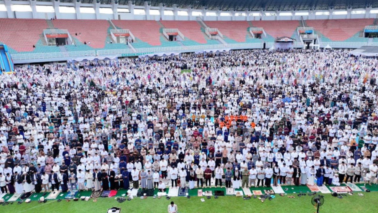 BOGOR – Pelaksanaan Salat Idul Fitri 1447 Hijriah/2026 Masehi di Stadion Gelora Pakansari, Cibinong, Kabupaten Bogor berlangsung meriah dan penuh antusiasme. Sejak pagi hari, ribuan jemaah sudah memadati area stadion hingga lapangan utama dipenuhi warga dari berbagai wilayah, Sabtu, (21/3/26)